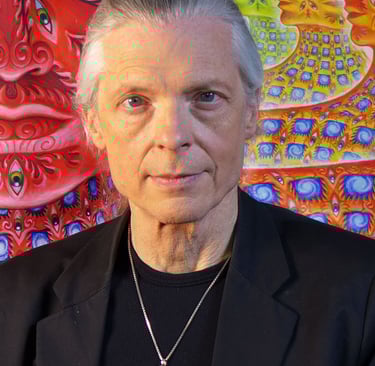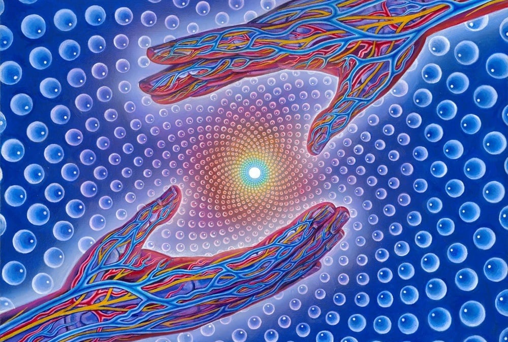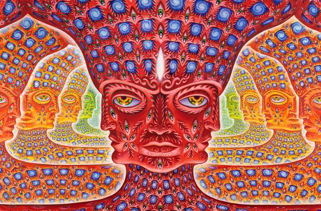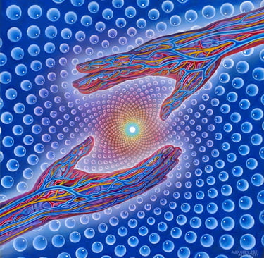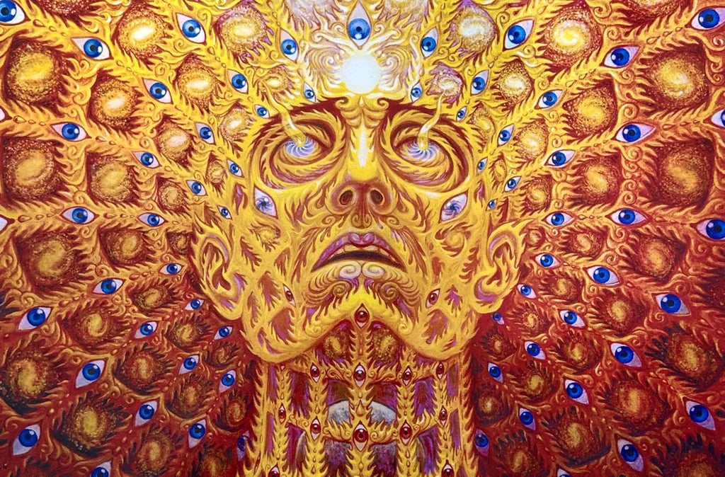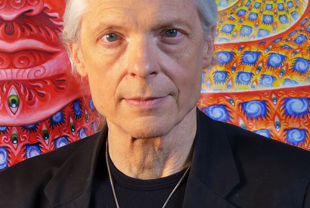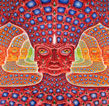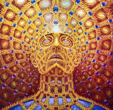 Alex Grey es un artista visionario estadounidense conocido por sus impactantes obras que exploran la espiritualidad, la anatomía humana y los estados de conciencia expandida. Nacido en 1953, Grey desarrolló un enfoque único del arte, fusionando sus estudios en bellas artes con su interés en la biología y su experiencia como ilustrador médico. Su trabajo es una fusión entre lo científico y lo trascendental, retratando figuras humanas en detalle anatómico, a menudo rodeadas de patrones energéticos que simbolizan la conexión entre el cuerpo, la mente y el universo.