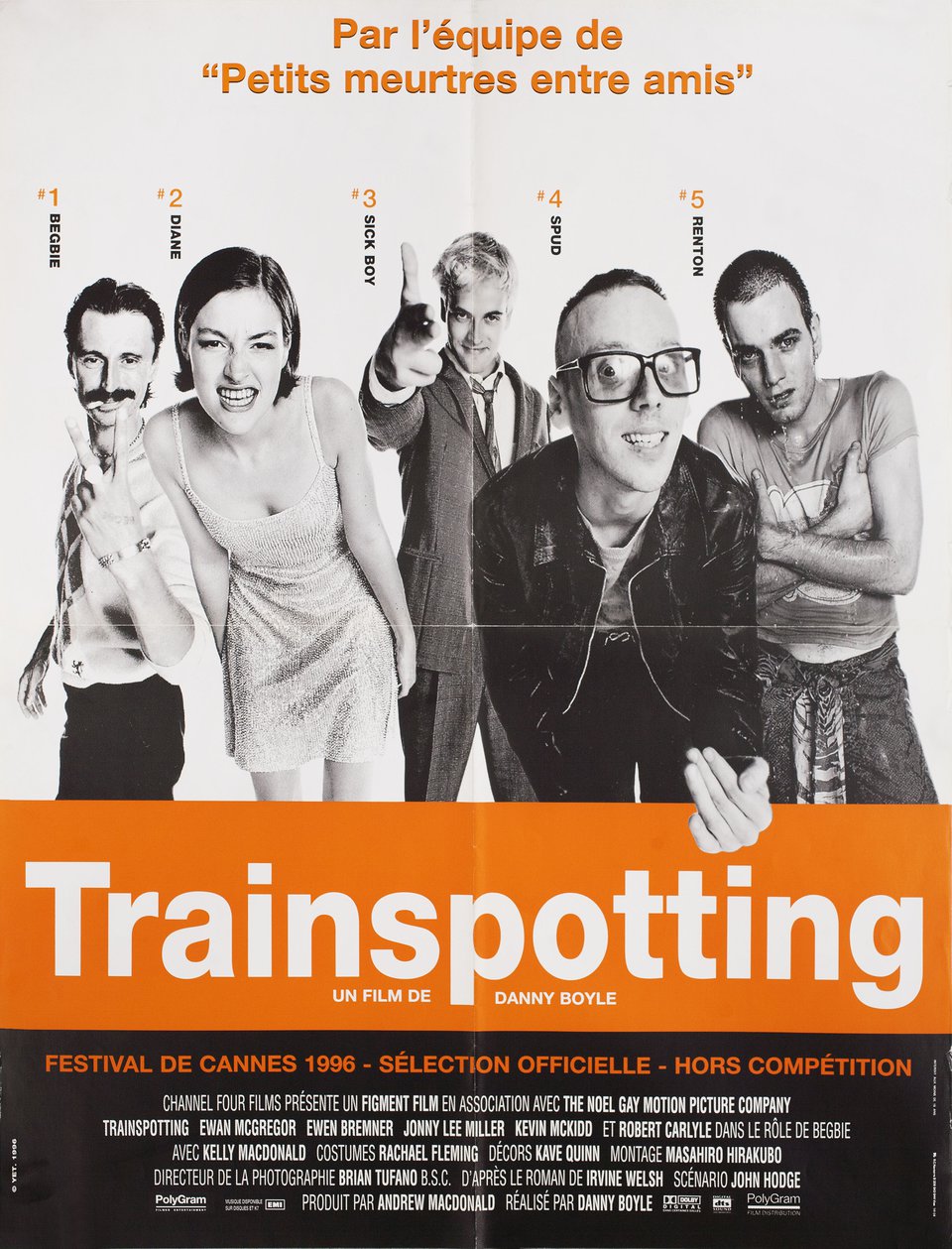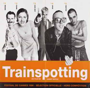 El póster de Trainspotting refleja la energía cruda y descontrolada de la película de Danny Boyle. Con un fondo blanco brillante y retratos en blanco y negro de los personajes principales en poses desafortunadas y provocativas, el diseño minimalista pero agresivo transmite perfectamente el caos, la irreverencia y el humor oscuro que impregnan la vida de los protagonistas inmersos en la cultura de las drogas de Edimburgo.